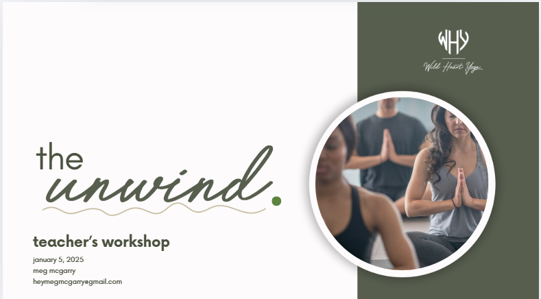 In January 2024, I led a workshop for yoga teachers at Wild Heart Yoga on the topic of the unwind: the studio’s newest class offering. I’ve been teaching the same class at 8 p.m. at WHY for the last decade, and as I’ve evolved so has it. Here’s the class description: